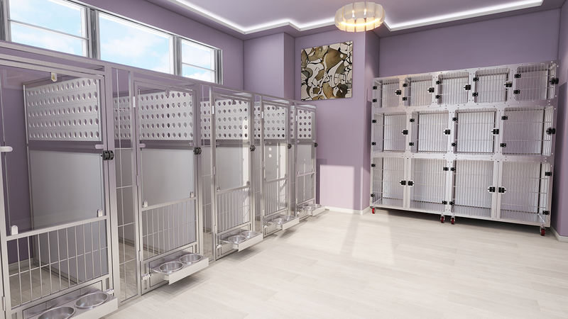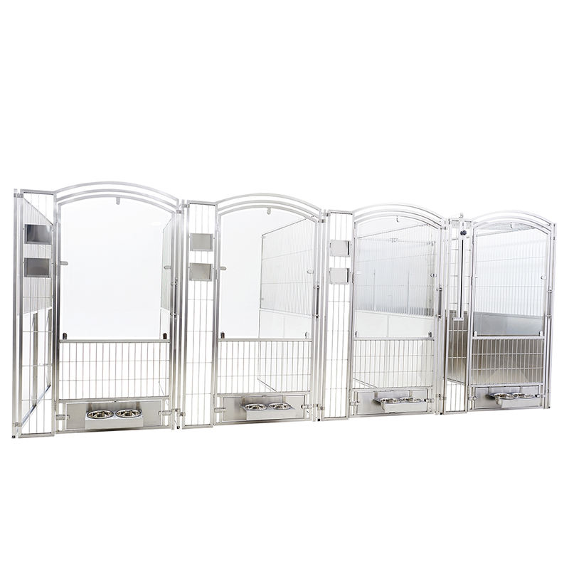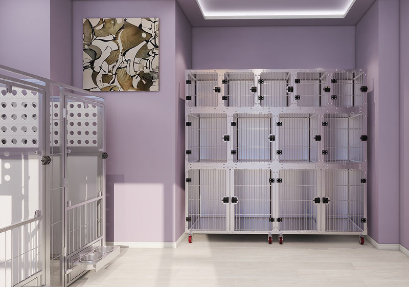 يستخدم قفص الحجر والحجر الصحي متعدد الأغراض زجاجًا قويًا آمنًا لضمان عمر خدمة طويل بشكل استثنائي مع منع خدوش الحيوانات تمامًا. يتميز جسم القفص الملحوم بالكامل بزوايا مستديرة لسهولة التنظيف والحفاظ على النظافة. يمكن وضع وحدات القفص مباشرة أمام النوافذ الموجودة، مما يجعلها مناسبة بشكل خاص لمناطق بيع الجراء والتبني.